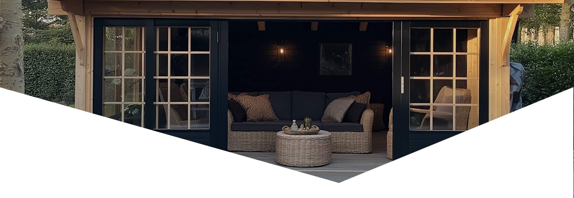 Grote raampartijen, openslaande deuren, schuifwanden of extra opbergruimte; alles wordt volledig op maat ontworpen. Het buitenverblijf sluit aan op jouw wensen, het gebruik én de beschikbare ruimte. Verlichting, verwarming en isolatie zijn eveneens mee te nemen in het ontwerp.